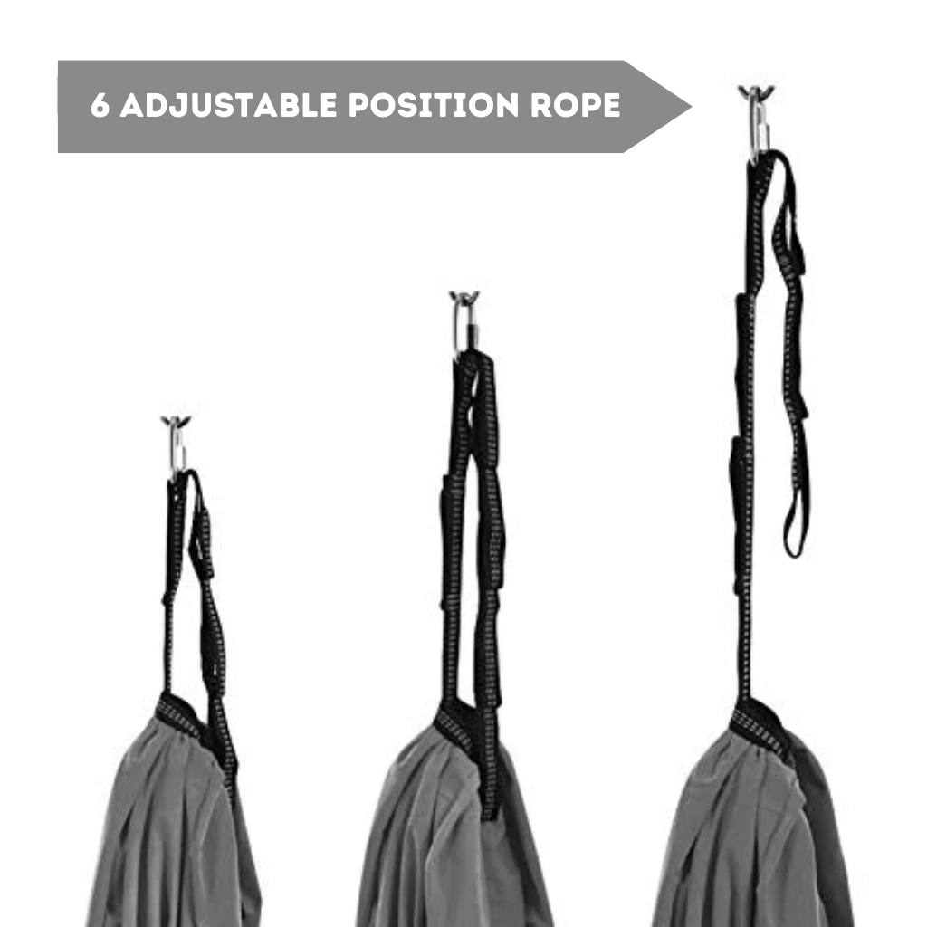 Package includes hammock swing, screw eye, carabiner clip, daisy chain strap, and wood and concrete attachments.