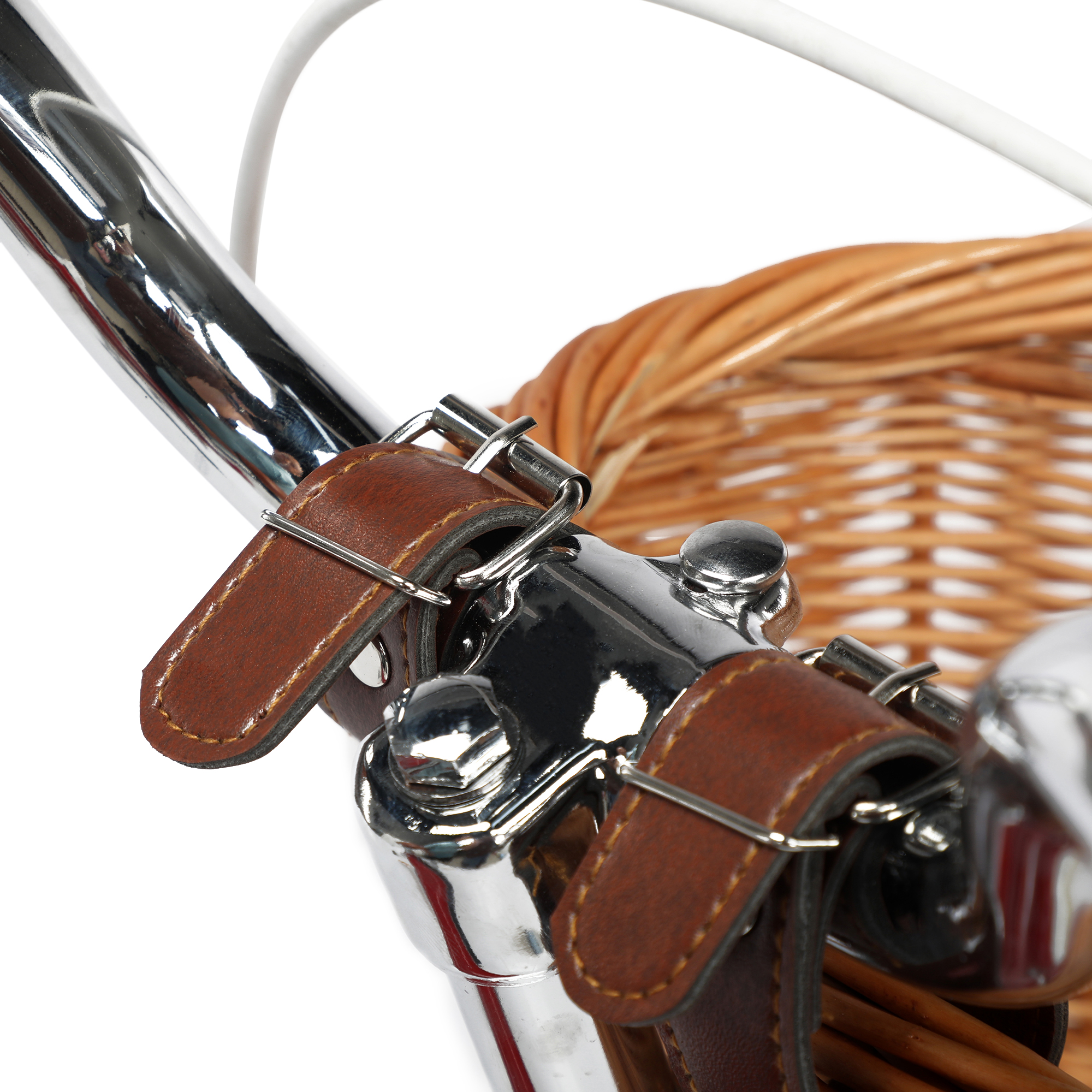 Adjustable faux leather straps make it easy to secure or remove the basket.