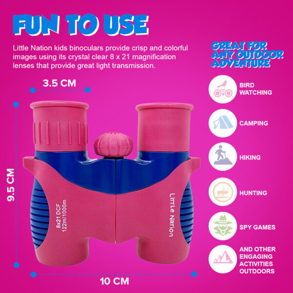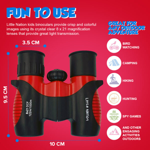 Product Descriptions: FUN TO USE: Little Nation kids binoculars provide crisp and colorful images using its crystal clear 8 x